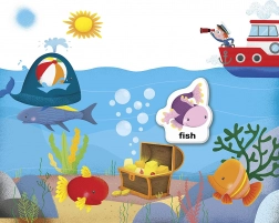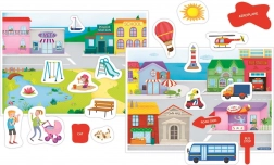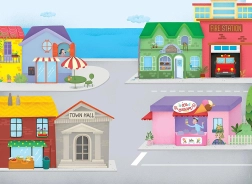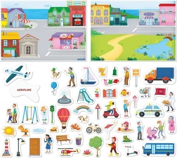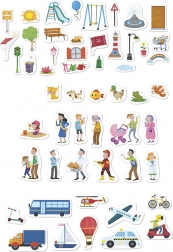 Dve bogato ilustrirani sceni spodbujata pripovedovanje zgodb in vajo besedišča o krajih, poklicih, prometu in živalih.