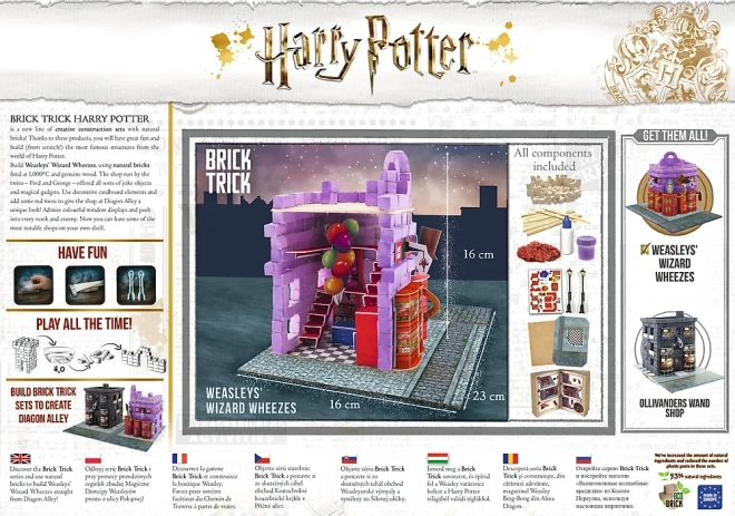 Ustvarite si doma čarovniški kotiček z barvito trgovino dvojčkov Freda in Georgea. Set Brick Trick združuje prave materiale – mini opeke in lesene deščice – z dekoracijami, ki zgradbi dodajo značaj. Korak za korakom boste zgradili stavbo od temeljev do končnega modela in jo na koncu okrasili s priloženimi elementi.