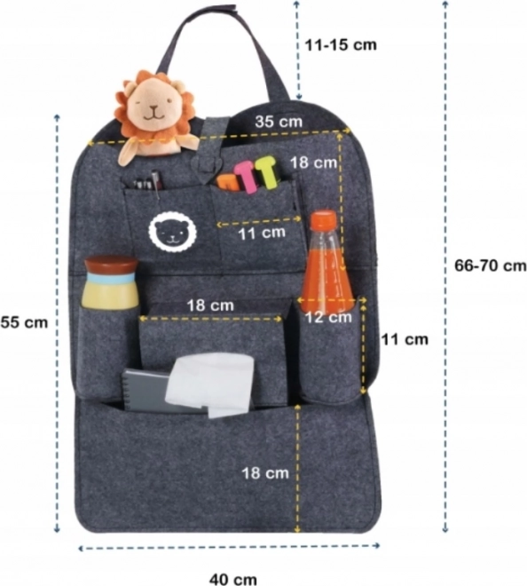 Univerzalni avtomobilski organizator LIONELO je idealen pomočnik za družine in pogoste popotnike. Zaradi premišljene razporeditve žepov boste igrače, pijačo, robčke in drobnarije shranili pregledno in varno. Nevtralna siva barva se prilega vsaki notranjosti in hkrati ščiti zadnji del sedeža pred brcami in umazanijo.