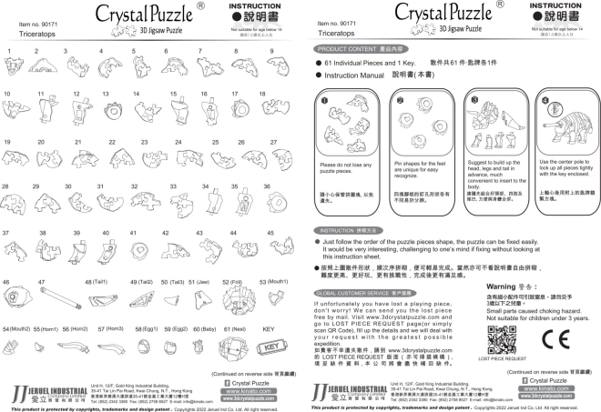 3D sestavljanka Triceratops z mladičem ponuja izvirno zabavo za vse starostne skupine. Vsak od 61 kosov je skrbno zasnovan za enostavno sestavljanje, rezultat pa je podroben in estetsko dovršen model. Brez namigov postane sestavljanje pravi izziv, navodila pa zagotavljajo enostavno sledenje pravilnemu postopku.