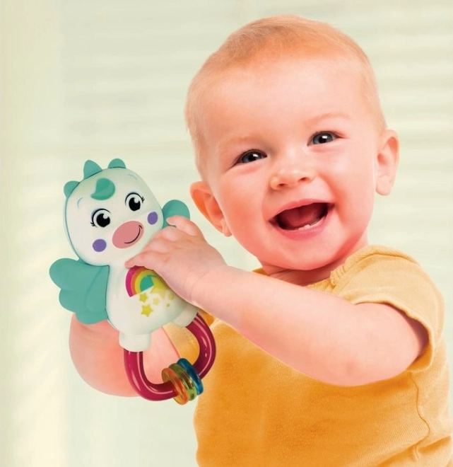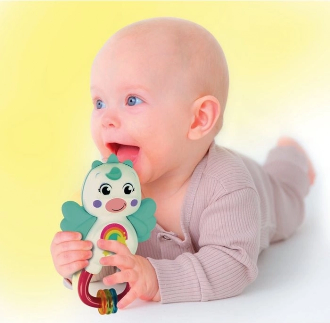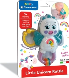 Ljubka interaktivna ropotuljica v obliki samoroga spodbuja čute in zabava dojenčka doma in na poti. Mehki grizala v obliki kril lajšajo razdražene dlesni, medtem ko različne strukture in materiali podpirajo razvoj tipa. Vgrajen vložek z ropotuljo stimulira sluh, praktična zanka pa omogoča enostavno pripenjanje kamor koli.