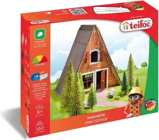 Gradbeni set TEIFOC Finska koča prinaša avtentično izkušnjo gradnje v varni otroški različici. Prave opeke in ekološka koruzna malta omogočajo gradnjo realistične A‑frame koče z okni in vrati. Po končani gradnji model le potopite v vodo, počakajte, da malta popusti, opeke posušite in lahko gradite znova.