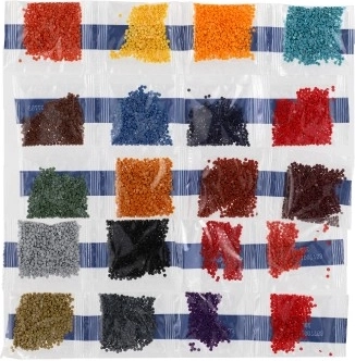 Platno s predtiskano podobo, pero za nanašanje kamenčkov, posodica, vosek in komplet barvnih kamenčkov.