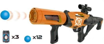 - Odličen komplet: tarče, bogata “municija” in akcijski dizajn v oranžni ali modri različici.
