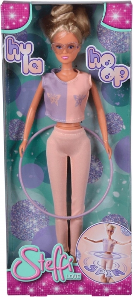 Punčka Steffi je idealna za male športnike! Prihaja z obročem hula hoop, ki se vrti okoli njenega pasu, in je oblečena v športna oblačila z belimi supergami.