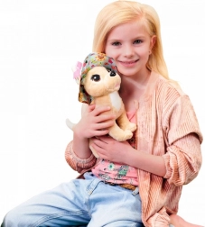 Plišasti pes Chihuahua z velikimi, izraznimi očmi in pisanim klobukom, odličen za objemanje.