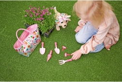 Vsebuje roza vrtnarska orodja, ki so lahka in otrokom prijazna, idealna za male vrtnarske projekte.