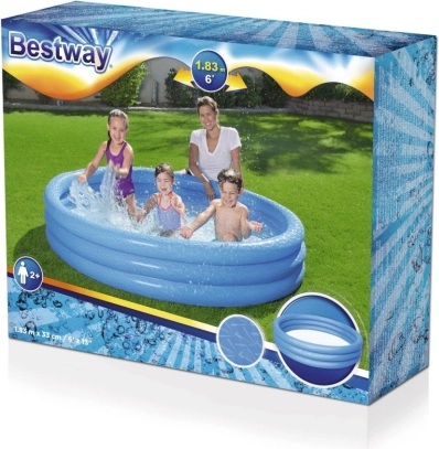 Uživajte v poletju s kompakt nim in enostavno sestavljivim bazenom BESTWAY s premerom 183 cm. Zahvaljujoč trem napihljivim obročem, odpornemu vinilu in varnostnim ventilom je idealen za osvežitev otrok na vrtu. Priložena je tudi popravna zaplata za brezskrbno uporabo.
