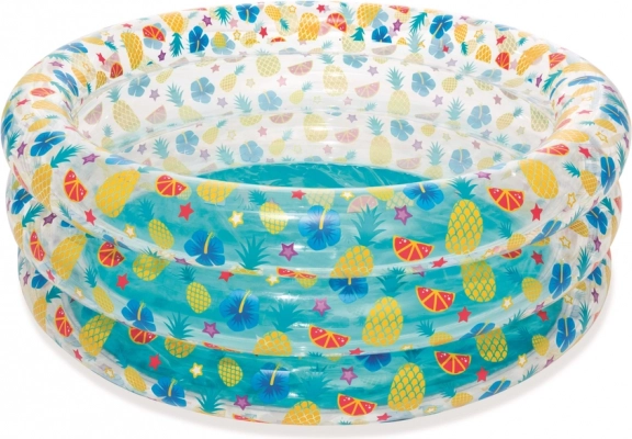 Ta otroški napihljiv bazen BESTWAY s prosojnimi stenami in barvitim sadnim potiskom prinese na vrt poletno vzdušje in veliko vodnih radosti. Zaradi kompaktnih mer se prilega tudi manjšim prostorom, po izpustu vode pa ga je enostavno shraniti.