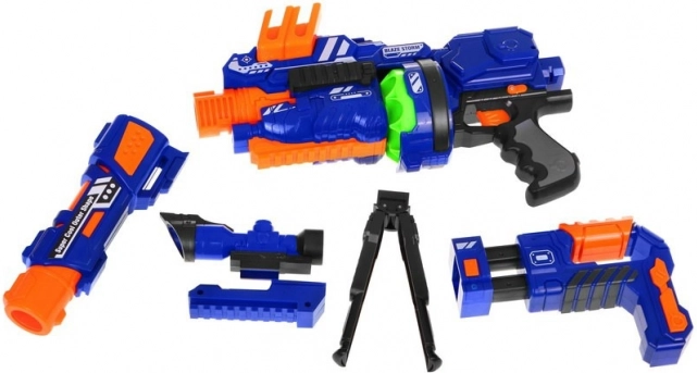Modularna otroška puška Blaze Storm prinaša akcijsko, a varno zabavo doma in na prostem. Električni polavtomat z bobnastim mehanizmom in nabojnikom omogoča hitre posamezne strele in kratke serije, pri čemer so penaste kroglice mehke in prijazne. Zahvaljujoč naglavnemu ščitu, stabilizatorju in možnosti podaljška cevi se lahko otroci učijo natančnega merjenja in ustvarjajo različne scenarije igre.
