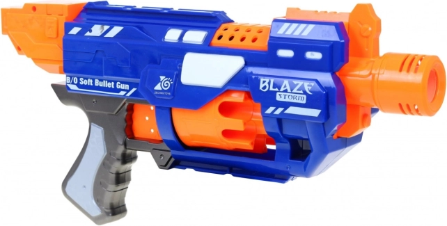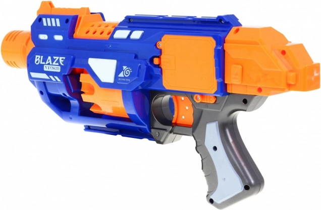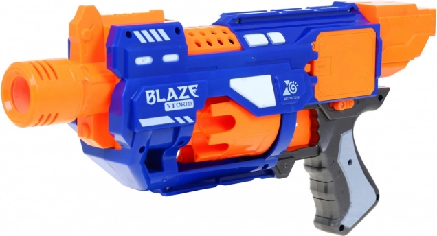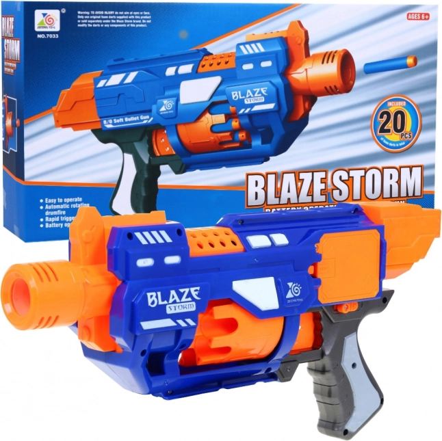 Zabaven in varen otroški blaster BLAZE STORM za starost 6+ z avtomatsko vrtečim se bobničem in udobnim upravljanjem. Vključuje 20 penastih puščic, ponuja doseg do 10 m in polavtomatski način streljanja za dinamično igro doma in na prostem. Napajanje z 3× AA baterijami (niso priložene).
