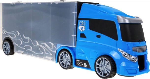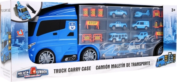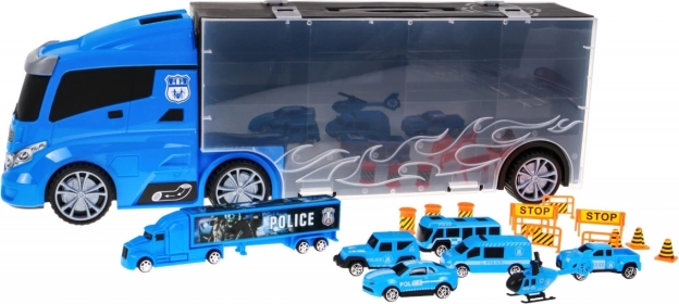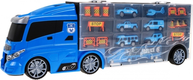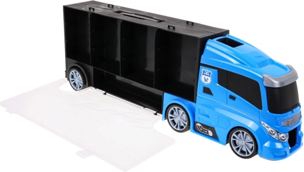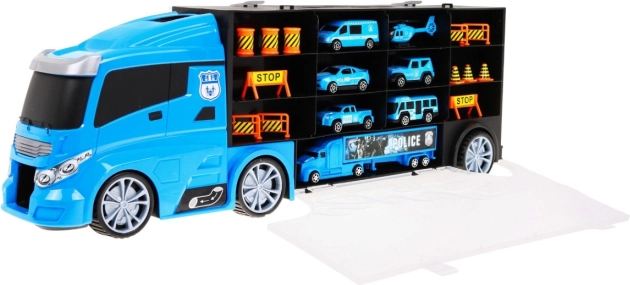 Odkrijte večnamenski policijski kamion, ki služi kot praktičen organizator za avtomobilčke in odličen igralni set. Na straneh sta dva odpirajoča se shranjevalna prostora – na eni strani 13 manjših predalčkov, na drugi 5 večjih. Nad kabino je vstop na tobogan, ki vodi skozi kabino in se konča na sprednjem delu vozila. Zgornja površina kamiona služi kot »letišče« za helikopter. Zahvaljujoč udobnemu ročaju lahko otroci set odnesejo kamor koli.