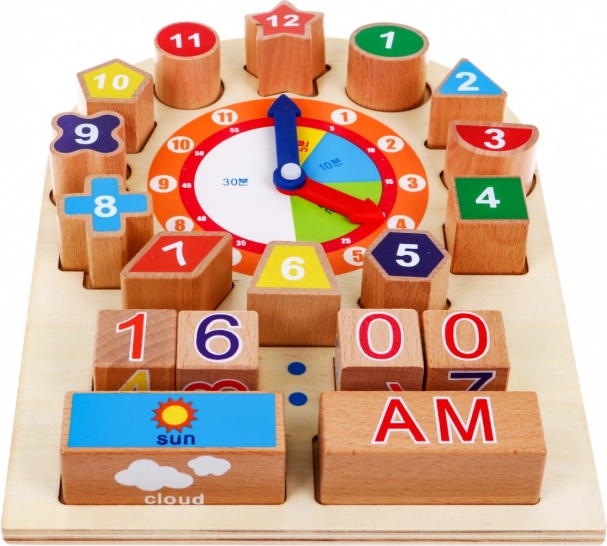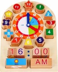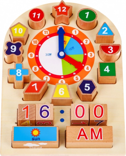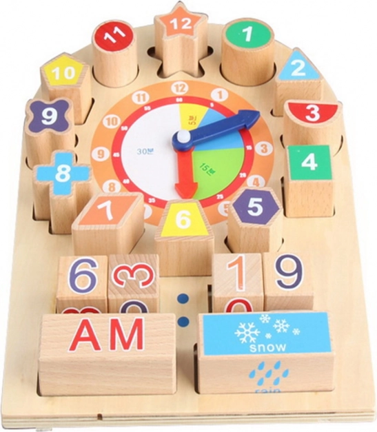 Ta leseni komplet ure pomaga vašemu otroku zlahka prepoznavati čas, del dneva, vreme in mesece. Vsebuje dve premični kazalki, ki ju je mogoče prosto nastaviti za različne ure. Otrok lahko takoj zapiše čas s pomočjo številčnih kock ter prepozna del dneva in ali je sončno, oblačno, deževno ali sneži. Številčne kocke imajo različne oblike, ki jih je treba pravilno namestiti na tablo.