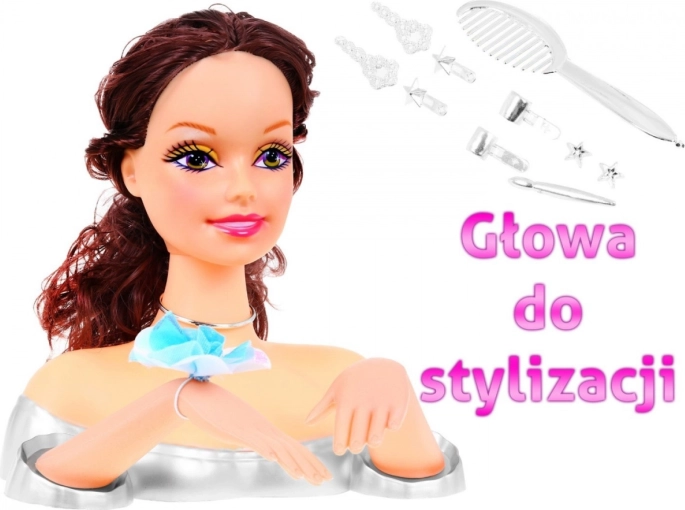 Glava punčke za česanje in ličenje bo razveselila vsakega otroka od 3. leta dalje. Ponuja dolge rjave lase in bogate dodatke za ustvarjanje pričesk. Priloženi so glavnik, elastika in sponke za kreativen stajling. Odlična ideja za darilo ter ure kreativne igre in razvoja fine motorike.