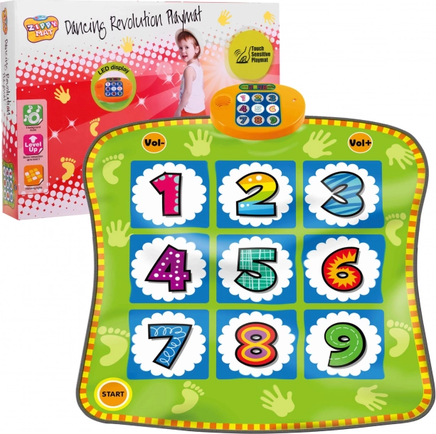 Velik barvni panel z zaslonom naključno izbira številke 1–9 in igro spremlja z zvoki. Izberite med 3 stopnjami težavnosti, prilagodite glasnost (VOL-/VOL+) in pustite, da se otroci varno zabavajo doma. Podloga se za varčevanje z energijo samodejno izklopi po 2 minutah nedejavnosti.