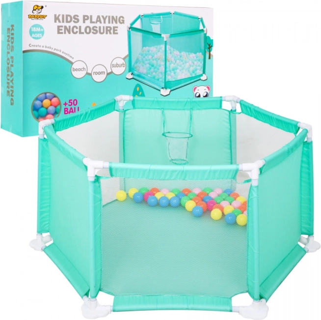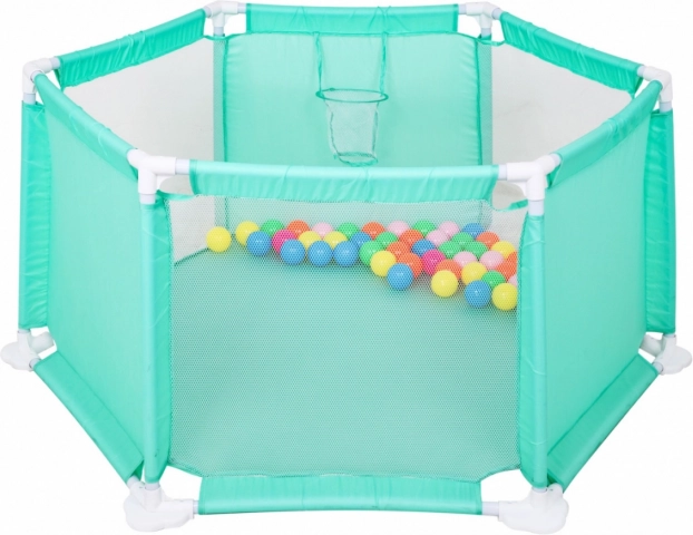 Ta ogradek za otroke od 18 mesecev naprej ponuja velikodušen prostor za varno in spodbudno igro. Prosojne mrežaste stene omogočajo stalen vizualni nadzor nad otrokom in hkrati zadržijo žogice v notranjosti. Stabilen cevni okvir s čvrstimi plastičnimi spojkami zagotavlja zanesljivost in dolgo življenjsko dobo, zaobljeni robovi pa povečujejo varnost.