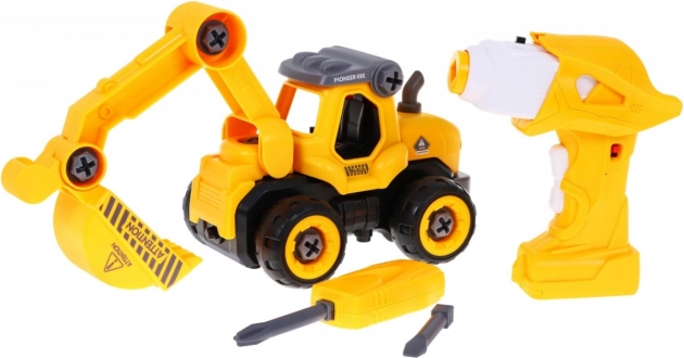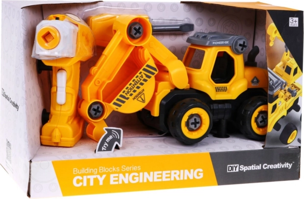 | | Ustvarjalna igrača za male inženirje. Komplet je sestavljen iz 28 delov. Bager sestavite s priloženim ročnim izvijačem ali električnim vrtalnikom. Vrtalnik ima 2 zamenljiva bita, ki ju lahko uporabite tudi kot ročni izvijač. Vrtalni modul po vstavitvi v bager le-tega požene v gibanje (vožnja naprej in nazaj). Igrača uči in hkrati zabava. Preprosto razumljiva navodila za sestavljanje bodo otroka korak za korakom vodila do uspeha. Igrača ima zvočne učinke (zvok vožnje in hupa – bager, zvok vrtanja – vrtalnik). Igrača je namenjena otrokom od 3 let naprej. Igrača je napajana z baterijami tipa 3 x AG – bager (priložene), 2 x AA – vrtalni modul (niso priložene) in 2 x AA (niso priložene) – vrtalnik. | |