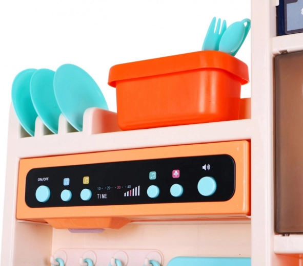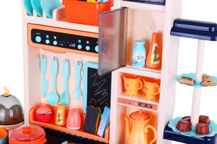 Velika večnamenska otroška kuhinjica za male kuharje od 3 let ponuja tekočo vodo iz pipe, interaktivni gorilnik s paro, svetlobne in zvočne učinke, odpirajočo se pečico in hladilnik ter bogat komplet 65 dodatkov, vključno s tablo za kredo in »kuhalnikom jajc« z zvoki.