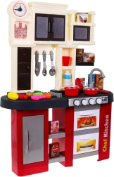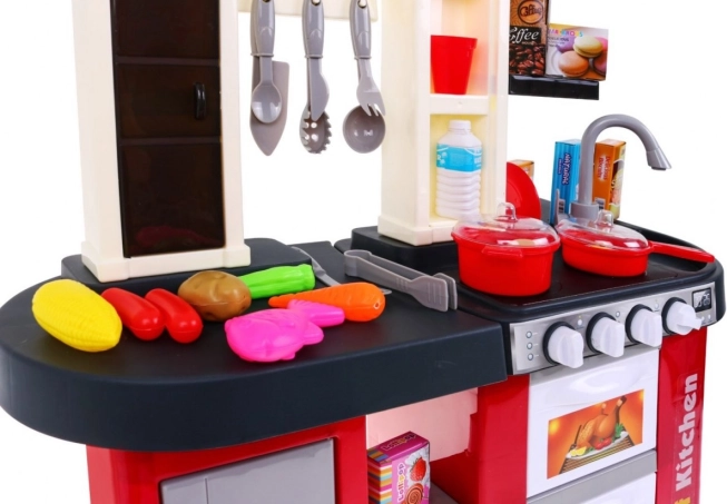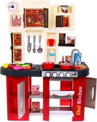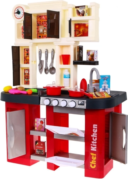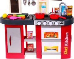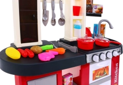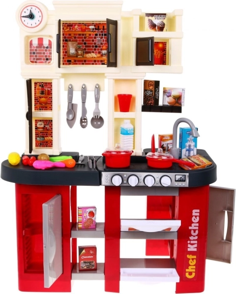 Ta prostorna plastična kuhinjica v rdeče‑črni zasnovi prinaša otrokom od 3. leta naprej avtentično izkušnjo kuhanja. Resnični svetlobni učinki in zvoki kuhanja ter cvrenja ob obračanju gumbov spodbujajo ustvarjalno igro in razvoj motorike. Del kompleta je tudi delujoča vodna pipa, ki zabavo dvigne na višjo raven.