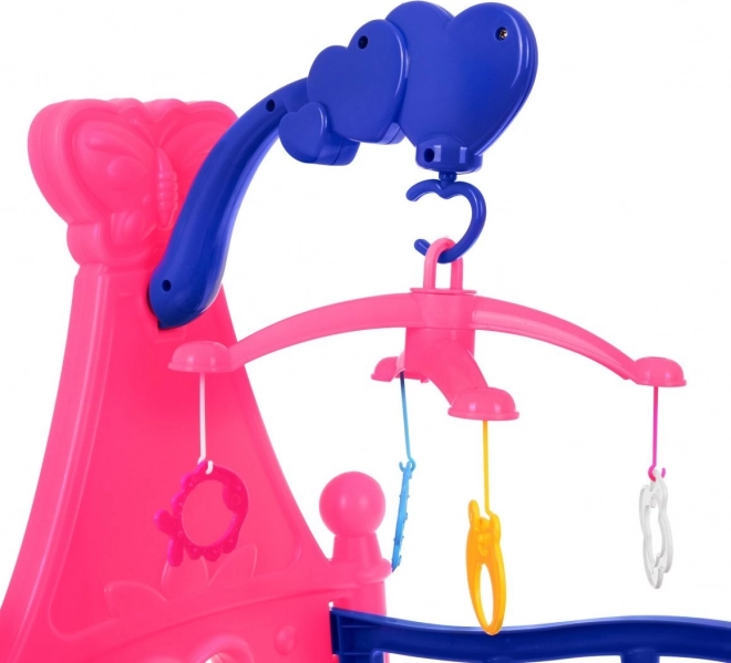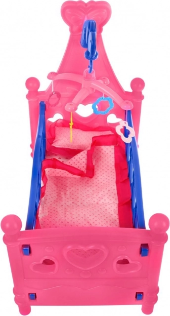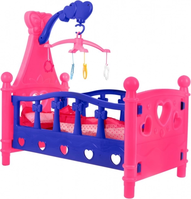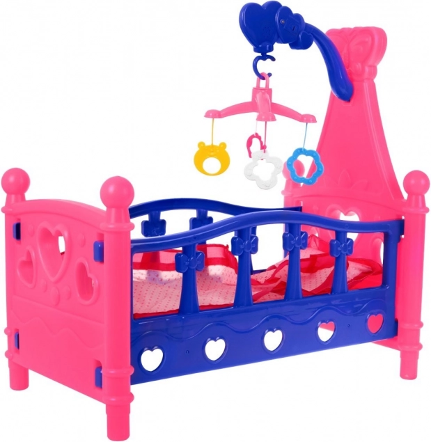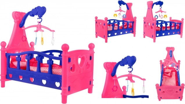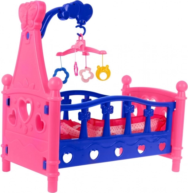Ta otroška posteljica za punčke je odličen dodatek vsaki otroški sobi. Izstopa z veselo rožnato-modro kombinacijo, srčkastimi izrezi in funkcionalnim kolovrátom z barvitimi obeski. Priloženi so tudi tekstilna vzmetnica, blazinica in odeja, da lahko najljubša punčka udobno zaspi.
