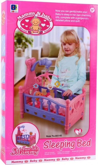 Prisrčna posteljica za punčke z barvitim vrtečim kolovrátkom in mehko opremo bo razveselila vsako malo skrbnico. Zahvaljujoč stabilni plastični konstrukciji, srčkastim detajlom ter priloženima blazinico in odejico je idealna za igro doma in uspavanje punčk. Kolovrát z visečimi igračkami spodbuja domišljijo, kompletna oprema v paketu prihrani čas staršem, enostavna montaža pa omogoča hiter začetek igre.