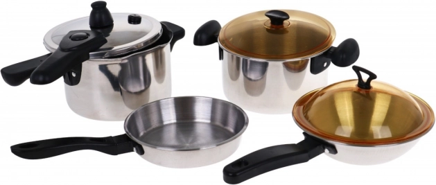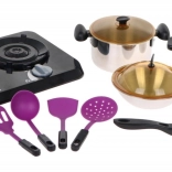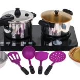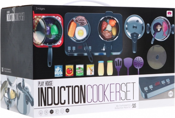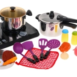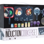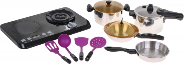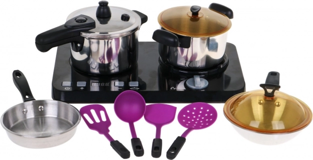 | Čudovit, odlično opremljen kuhinjski komplet, ki je sestavljen iz indukcijske kuhalne plošče, loncev in pripomočkov za kuhanje, je namenjen otrokom od treh let naprej. Ponev, lonec in ekonom lonec izgledajo kot pravi, vendar v pomanjšani različici. Indukcijska kuhalna plošča deluje na 3 baterije AA 1,5 V (niso priložene) in je opremljena z zvočnimi in svetlobnimi učinki. Na levi strani je osvetljen gorilnik z zvoki kuhanja in panelom za nastavitev časa kuhanja od 2 do 20 minut. Na desni je osvetljen gorilnik z zvoki cvrtja ter gumbom za vklop/izklop. V paketu so priložene tudi imitacije živil. | ||