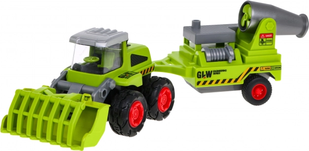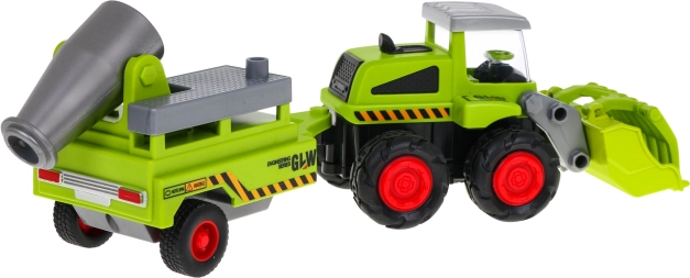 Kovinski kmetijski nakladač s prikolico je idealna igrača za male kmete, starejše od treh let. Ta igrača vključuje gibljivo kovinsko žlico in snemljivo prikolico s škropilnico, gumijasta kolesa in pogon zadnje osi.