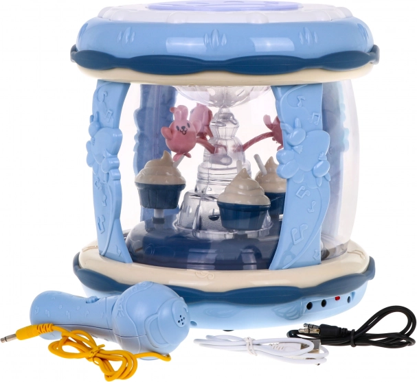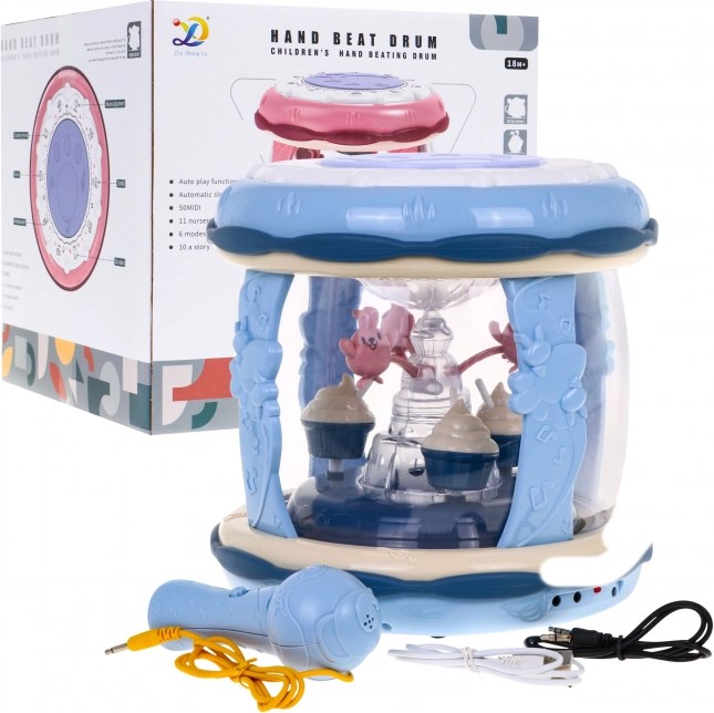 Ta interaktivna glasbena kocka razvija ritem, sluh in fino motoriko. Otroci lahko bobnajo na zgornji boben, pojejo v mikrofon in opazujejo barvno osvetljen vrtiljak na sredini kocke. Glasbeni panel ponuja bogato izbiro melodij, izštevank in zgodb – idealno za prve glasbene korake.