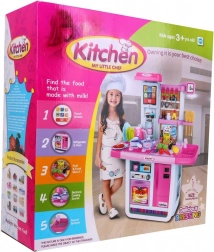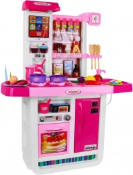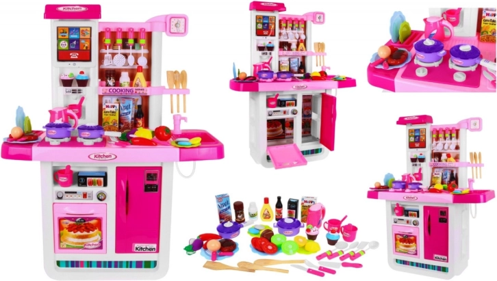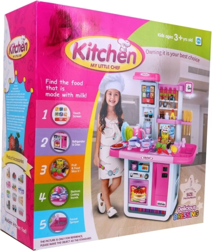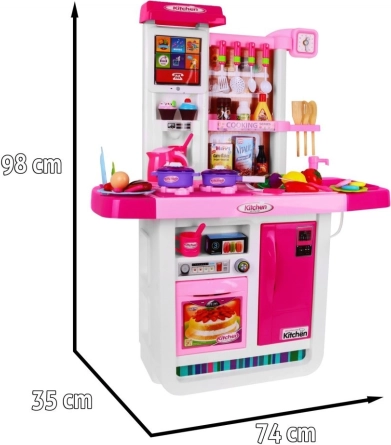 Ta prostorna kuhinja otrokom prinaša realistično izkušnjo kuhanja: dva gorilnika z lučkami in zvoki pečenja ter kuhanja, pomivalno korito s potisno pipo, iz katere resnično teče voda, ter odpirajoča se pečica in hladilnik. Zaslon na dotik ponuja zvoke živali, melodije, učenje števil 1–10 v angleščini, nastavitev glasnosti, zvonjenje telefona in druge učinke. Zaradi živih barv in kakovostne izdelave je kuhinja idealna za vsakodnevno igro.