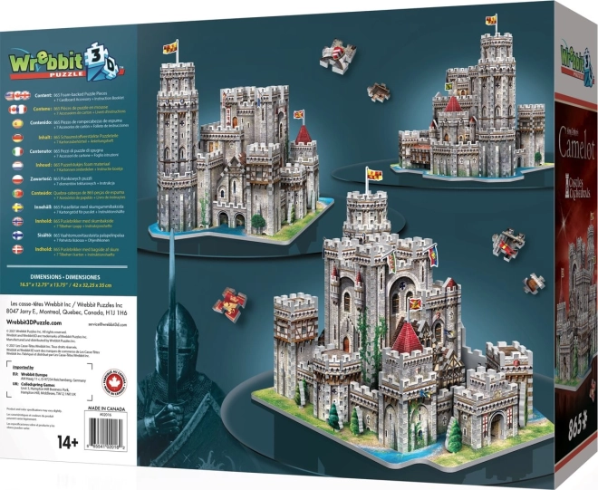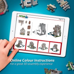 Doma ustvarite impresiven model gradu Camelot s stolpi, merlaturami in zastavami. Zahvaljujoč posebnemu materialu in natančnemu oblikovanju koščkov model trdno drži brez potrebe po lepilu ali orodjih. Sestavljanje poteka po preglednih referenčnih slikah in črno-belem ilustriranem priročniku.
