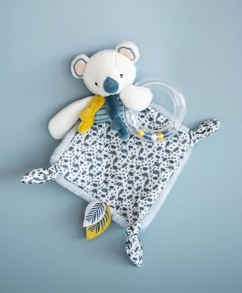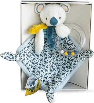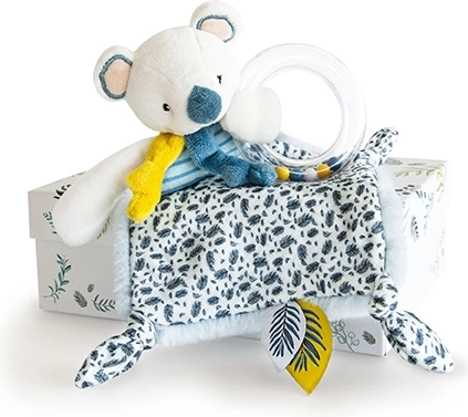 Plišasti komplet Koala Yoca je popolno darilo za novorojenčke, saj nudi mehkobo in udobje z dodatno zabavo zahvaljujoč ropotuljici.