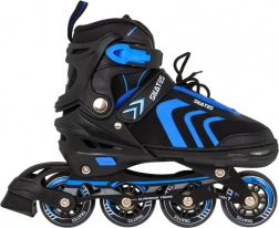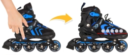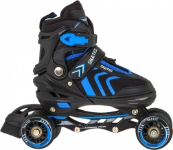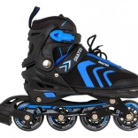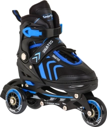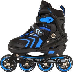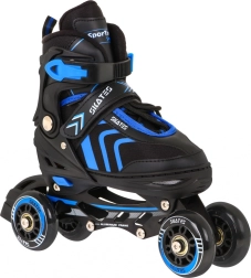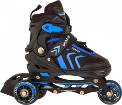 Univerzalen komplet za male drsalce združuje 4v1: inline rolerje, trekové (quad) rolerje in ledene drsalke z možnostjo hitre zamenjave nastavkov. Zahvaljujoč petstopenjski nastavitvi velikosti 29–33, udobni podlogi iz EVA pene z materialom Velvet ter čvrsti poltrdi konstrukciji nudi udobje, stabilnost in varnost. Aluminijasto ogrodje, ležaji ABEC-7 in PU kolesca 64 mm 85A zagotavljajo gladko in zanesljivo vožnjo, za zaviranje skrbi zavora na desnem rolerju.