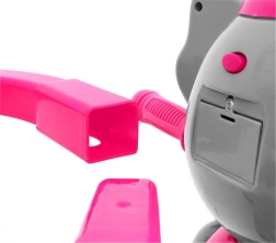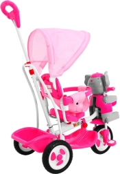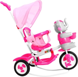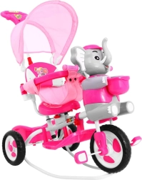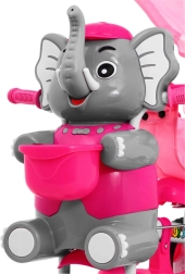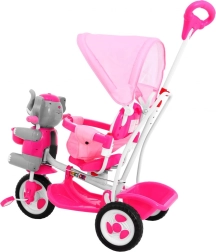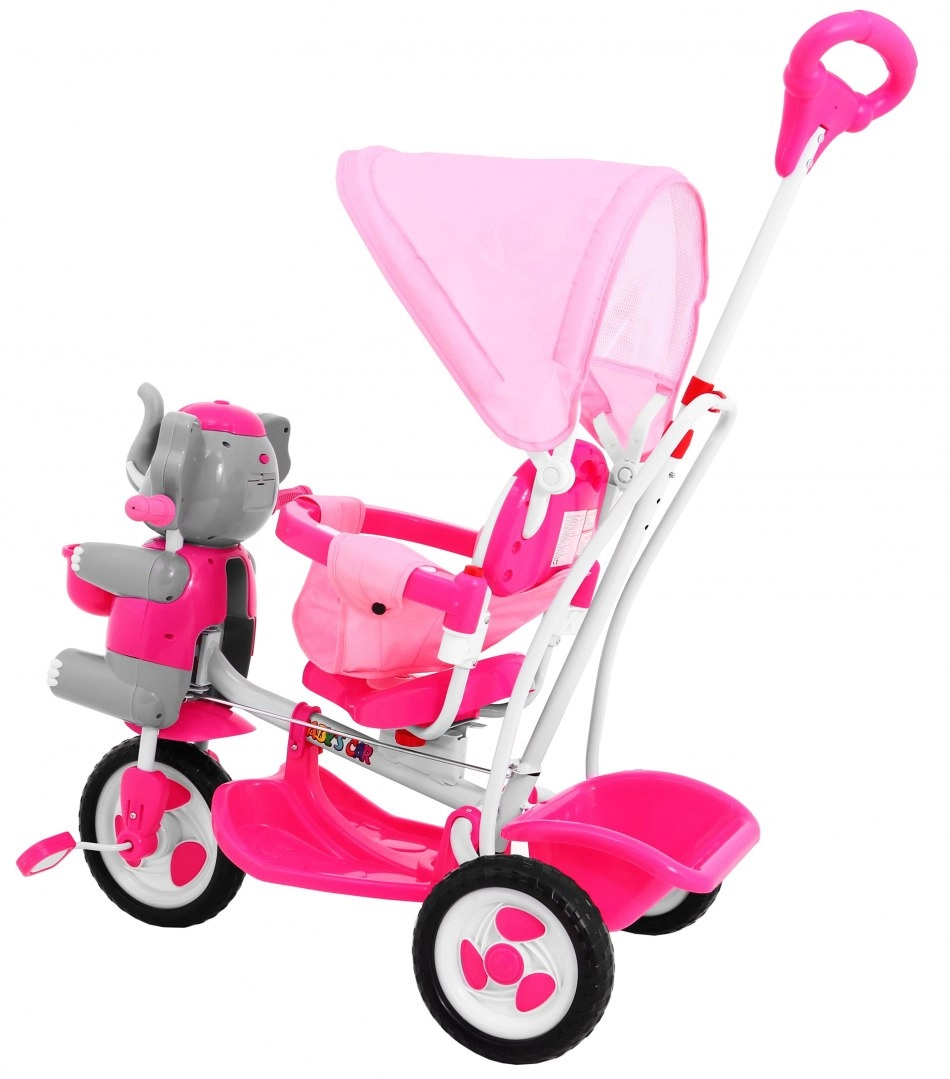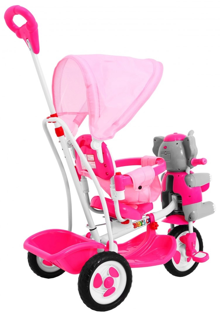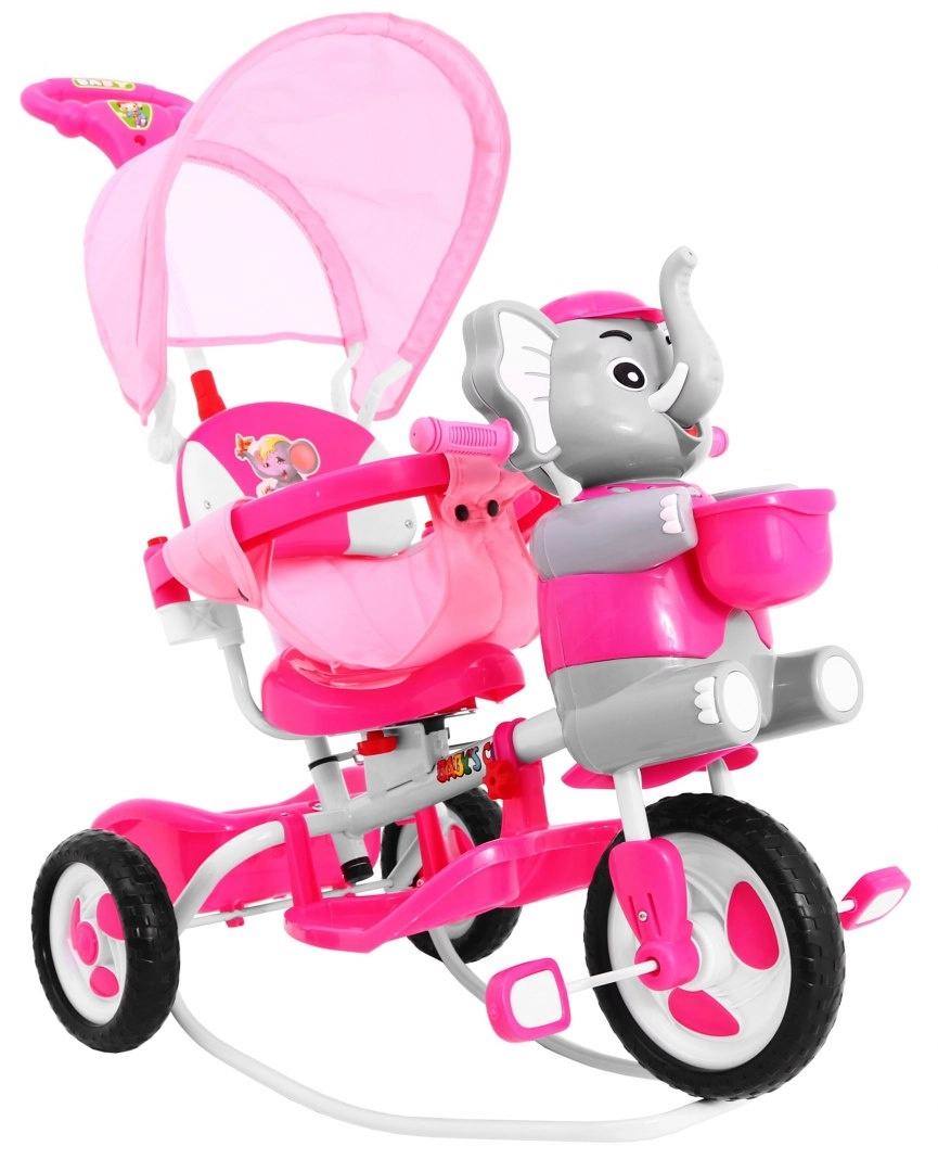 Široka kolesa iz mehke pene tiho in udobno blažijo neravnine, sprednje kolo s sklopko olajša upravljanje, odstranljiva opora za noge pa podpira otroke, ki še ne poganjajo. Slonček na sprednjem delu skriva skritko za drobnarije, na krmilu pa so zabavni zvočni efekti. Ne manjkajo zadnji košek, prevleka sedeža in velika sončna strešica za vožnjo v vsakem vremenu.