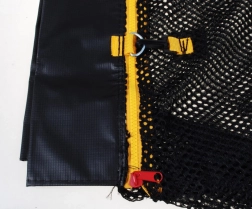 Zanesljiva zaščitna mreža SkyRamiz poskrbi za varnost otrok in odraslih pri skakanju. Mreža je izdelana iz kakovostnega PE materiala z višjo gramatura, zato je odporna na vremenske razmere in mehansko obrabo. Barvno poudarjena dvosmerna zadrga izboljša vidnost vhoda ter olajša odpiranje in zapiranje.