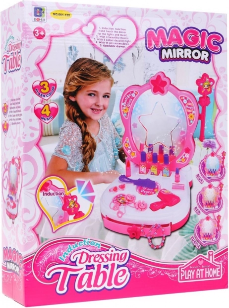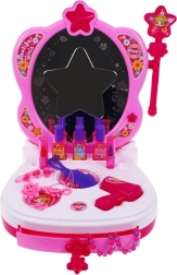 Ta interaktivna rožnata toaletna mizica z zvezdnim ogledalom bo polepšala vsak otroški kotiček. Ogledalo sveti v treh barvah (modra, rdeča, rožnata), čarobno vzdušje pa dopolnjuje s štirimi melodijami. Zahvaljujoč bogatim dodatkom otroci zlahka posnemajo priljubljene lepotne rituale ter se potopijo v svet domišljijskega ličenja in pričesk.