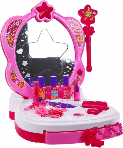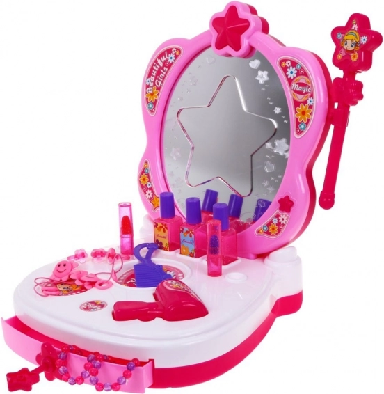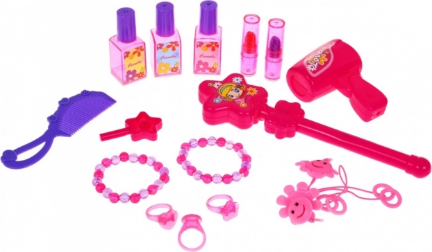 Komplet je zasnovan za varno in veselo igro – vsebuje imitacije kozmetike, otroški sušilnik za lase, glavniček, nakit in čarobno palčko, s katero se lahko vsaka deklica počuti kot princesa. Kompaktne mere ga naredijo odlično prenosno igračo za na pot in za doma.
