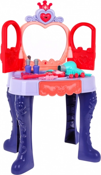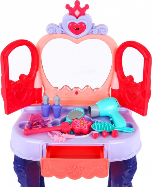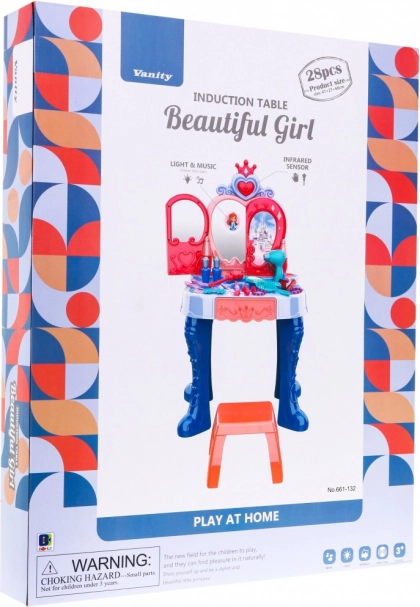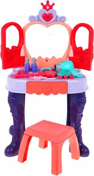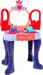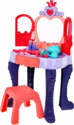 Mizica ima praktičen izvlečni predal za vse drobnarije ter bogate dodatke: glavniček, ogledalce, prstančke, zapestnice, sponke, elastike in imitacije šmink ter parfumov. Stabilna konstrukcija, prijetne dimenzije in udoben stolček zagotavljajo udobje pri igri in enostavno postavitev v otroški sobi.