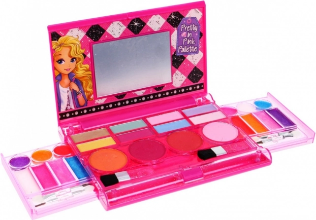 Prisrčna rožnata paleta ličil za otroke od 5 let prinaša barvna senčila in šminke, priročne čopiče ter zrcalce v zložljivi paleti. Vse je shranjeno v kompaktni etui, idealnem za na pot. Izdelano iz varnih materialov in zasnovano tako, da spodbuja ustvarjalnost ter fino motoriko.