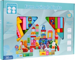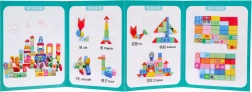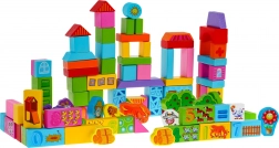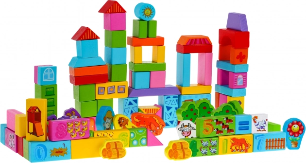 Ta bogat komplet lesenih kock otrokom prinaša ure smiselne zabave. Kocke so izdelane iz kakovostnega lesa, lakirane z varnimi barvami in imajo gladke, zaobljene robove brez ostrih delov za udobno in varno igro. Različne oblike in barve spodbujajo gradnjo hišk, stolpov, mostov in preprostih vozil.