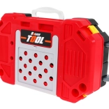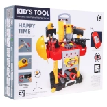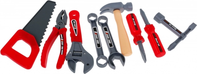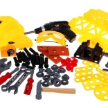 Priložena je bogata oprema: akumulatorski vrtalnik/izvijač, kladivo, primež, žaga, klešče, imbusni in vilasti ključi, izvijači, vijaki, matice, zobniki, meter ter delovni elementi z navoji za neskončno privijanje in montažo. S pametno organizacijo orodij si otroci urijo red, potrpežljivost in koordinacijo oko–roka.