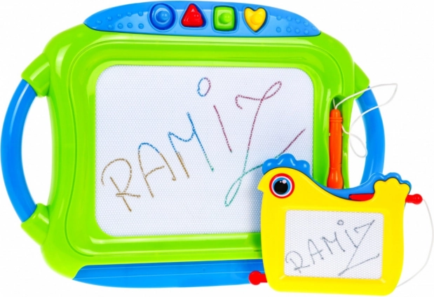 Ta komplet vsebuje veliko magnetno tablo z večbarvnim učinkom risanja in štirimi žigi ter manjšo tablo z enobarvnim zapisom. Obe tabli imata pritrjeni peresi na vrvici, da se ne izgubita, in praktičen drsnik za hitro brisanje ustvarjenih motivov.