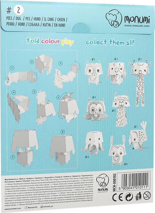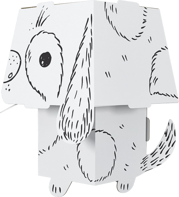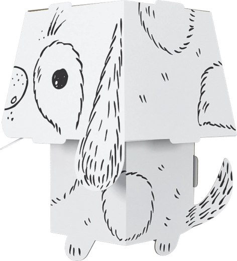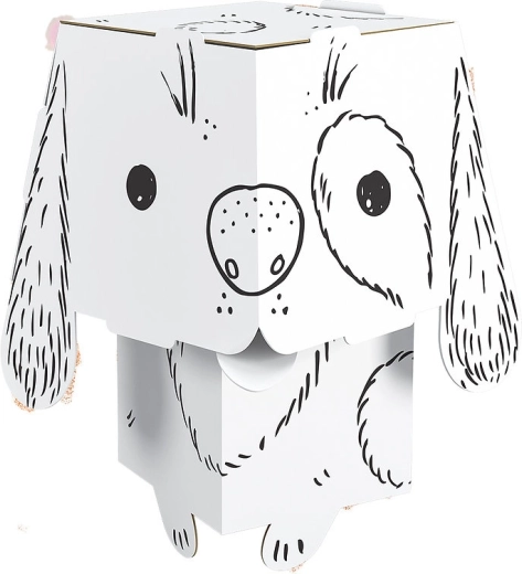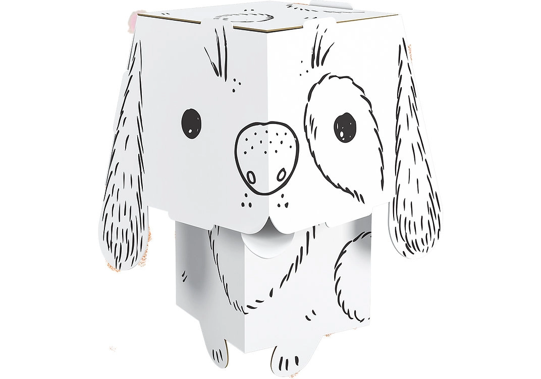 Zabavna in ustvarjalna 3D sestavljanka za barvanje v obliki psa iz belega kartona ponuja otrokom ure domiselne igre. Deli so natančno izrezani in se preprosto sestavijo brez lepila in škarij. Stabilen in lahek model s profesionalno črno-belo grafiko je idealen za barvice, flomastre, markerje in barve; karton dobro vpija vlago, se ne mečka in ne prepušča.