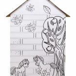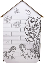Odkrijte prostorno kartonasto hišico XXL, ki si jo lahko otroci sami sestavijo in okrasijo po lastnih željah. Čiste bele površine s črnimi obrisi konj in narave kar vabijo k barvanju z barvicami, flomastri ali voščenkami (pripomočki niso priloženi).
