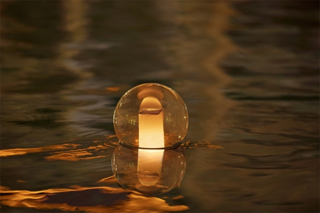 Ohranja vodo higiensko čisto in zvečer ustvari prijetno ambientalno svetlobo brez kablov – sončna celica napaja LED z avtonomijo 6–8 ur.