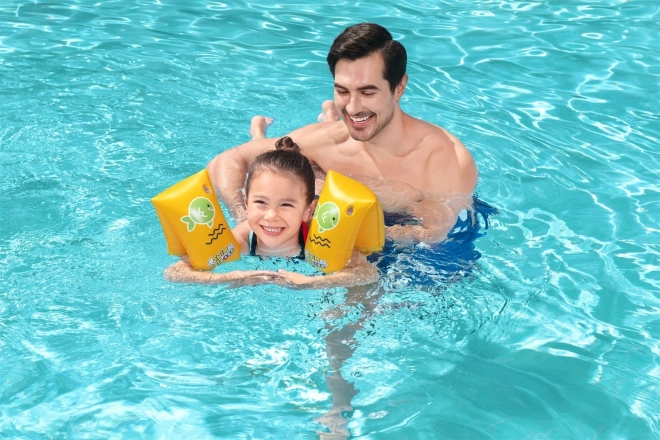 Intenzivno rumeni rokavčki z zeleno ribico so dobro vidni in otroke spodbujajo k igri ter učenju v vodi.