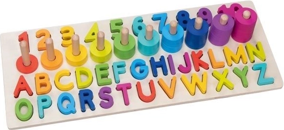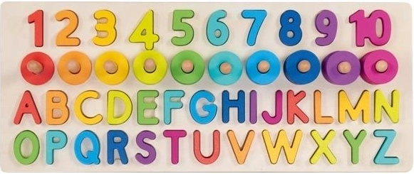 Naša sestavljanka vsebuje 91 različnih elementov, vključno z leseno osnovo, črkami (26 kosov) in številkami od 1 do 10 ter 55 barvnimi obročki. Otroci lahko tako zlahka vadijo prepoznavanje in seštevanje števil ter tvorjenje preprostih besed.