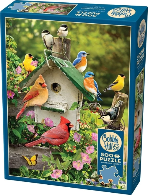 Stilska sestavljanka COBBLE HILL z motivom Poletna ptičja hišica ponuja 500 kosov z netipičnim izrezom in nepravilnimi oblikami, ki prinašajo višjo zahtevnost in daljšo zabavo. Del pakiranja je predloga 30,5 × 22,9 cm; po sestavitvi ima slika dimenzije pribl. 48,9 × 67,6 cm.
