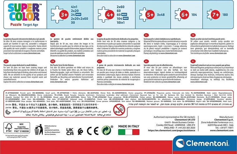 Kakovostna izdelava znamke Clementoni zagotavlja žive barve, natančne oblike in prijetno površino koščkov. Končane slike lahko znova in znova razstavite in sestavite ali jih podložite ter spremenite v dekoracijo otroške sobe.
