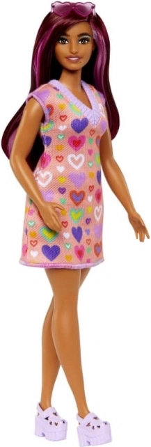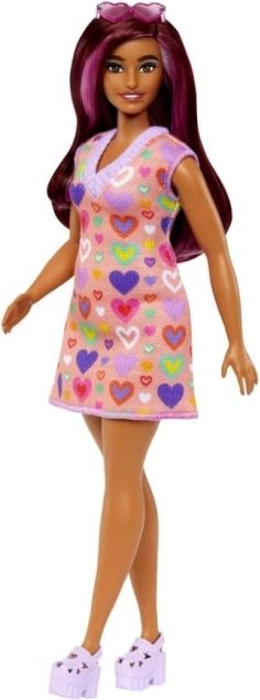 Punčka BARBIE Fashionistas je zasnovana tako, da odraža svet, kot ga danes vidijo otroci – poln sloga, idej in edinstvenosti. Njena privlačna polt in dolgi lasje z rožnatimi prameni poudarijo poseben videz, medtem ko oprijeta obleka z barvitim potiskom srčkov in rebrastim izrezom outfitu doda šarm.