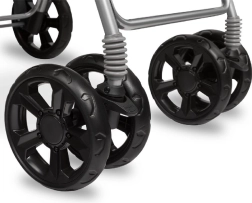 Vzdržljiva EVA kolesa z mehkim vzmetenjem sprednje osi blažijo vibracije. Zaklep za vožnjo naravnost pomaga na tlakovcih in neravninah.